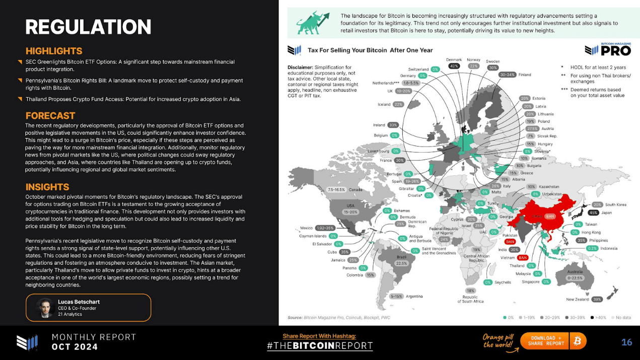 10 月是比特幣監管格局的關鍵時刻,SEC 批准比特幣 ETF 選擇權交易證明了傳統金融對加密貨幣的接受度越來越高。這一發展不僅為投資者提供了額外的對沖和投機工具,而且從長遠來看,還可能提高比特幣的流動性和價格穩定性。