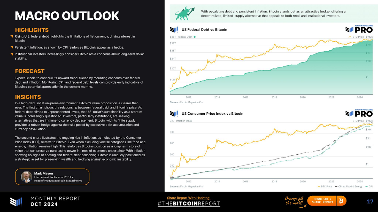 在高負債、通膨傾向的市場環境中,比特幣的價值主張比以往任何時候都更加清晰。下方第一張圖表顯示了聯邦債務與比特幣價格之間的關係。隨著聯邦債務攀升至前所未有的水平,美元作為價值儲存手段的可持續性受到越來越多的質疑。投資者,尤其是機構投資者,正在尋求不受貨幣貶值影響的替代方案。比特幣的供應有限,可以有效對沖過度債務累積和貨幣貶值帶來的風險。