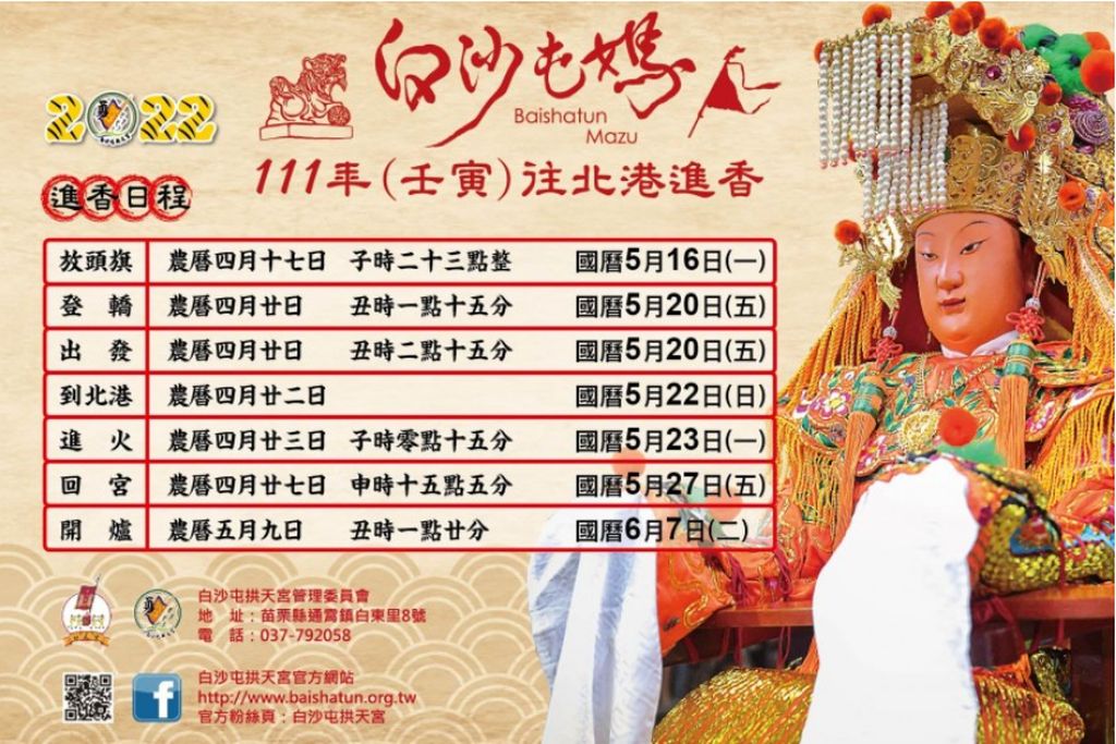 苗栗縣通霄鎮白沙屯拱天宮媽祖,於去年農曆12月15日(實為國曆今年1月17日)經廟方擲筊擇日,將於5月20日凌晨起駕出發,5月22日到北港,5月27日下午回宮,全程8天7夜。