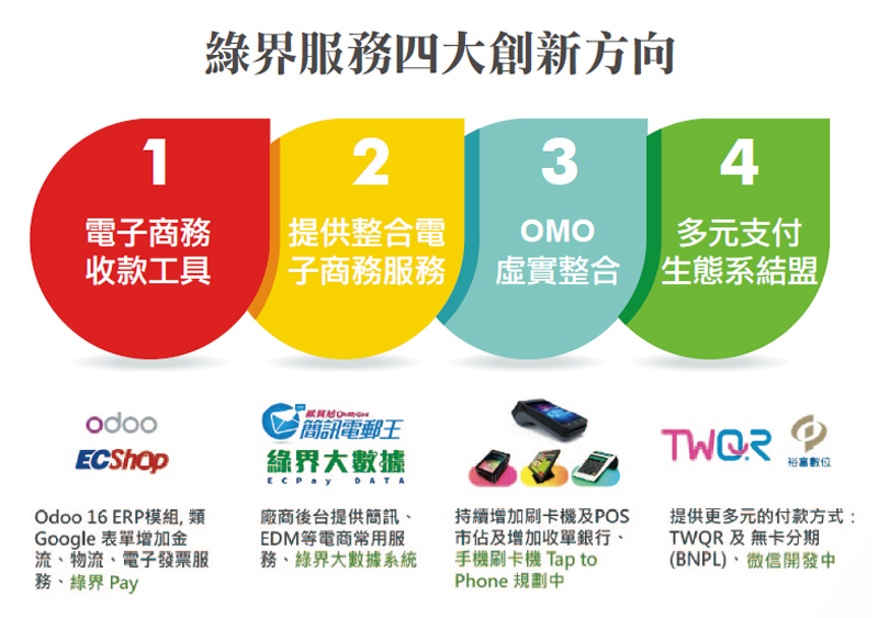 董事長梁維誠表示,未來將會拓展大數據新業務,提升產品競爭力及客戶滿意度,並強化收款工具,持續提供更多元收款工具,如:刷卡機、綠界表單、綠界Pay、手機刷卡Tap to phone,提升收款服務的效率和便利性,同時與多元支付結盟,提供多元的金流支付方式,為消費者提供更加多元化、便捷的支付選擇,確保綠界科技能持續穩固其在第三方支付市場的龍頭地位。