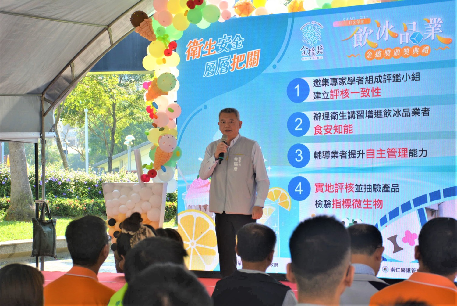 市府衛生局在11/17日的金搖獎頒獎表揚中,林瑞彥副市長表示,手搖飲以及冰品已經成為國人生活飲食中不可或缺的一部份,幾乎隨處可見人手一杯,凸顯飲冰品的衛生食安問題須受重視,嘉義市的飲冰品業者約有557家,嘉義市政府衛生局在食品安全風險分析規劃下,於111年全台首創專屬於嘉義市的食安招牌-飲冰品業「金搖獎」,今年延續辦理第二屆,透過召集食品衛生安全專家及衛生局稽查人員組成輔導、評核團隊,完成輔導120家飲冰品業者,並篩選出40家業者進行現場評核及進行產品抽檢驗,經過層層嚴格篩選,最終評選出31間優良店家通過評核,通過率約77.5%。