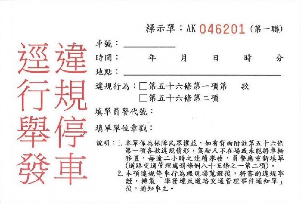 許多民眾都有違規停車遭開單經驗,如果駕駛當下不在場,警方就會先開出「違規停車逕行舉發標示單(俗稱白單)」置放於違停車輛上,後續才會寄發「舉發違反道路交通管理事件通知單(俗稱紅單)」正式裁罰,放置標示單是為了避免同一違規停車行為未逾2小時,遭不同員警重複舉發而產生民怨,標示單並非法令規定之表格,僅供執勤人員辨識之用,對民眾不具拘束力,即使員警沒有放置標示單,只要違規行為屬實,仍會遭到舉發。