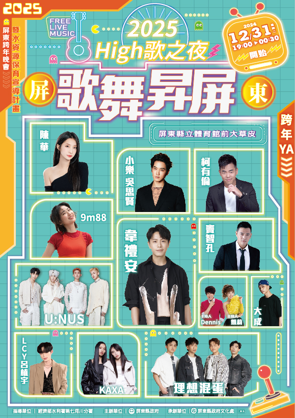 2025屏東縣跨年演唱會「歌舞昇屏 High歌之夜」將於12月31日晚間7時在屏東體育館前草地登場。屏東縣政府今(25)日正式公布超強卡司陣容,包括金曲才子韋禮安、全方位男神「小樂吳思賢」等11組歌手輪番登場,帶來精彩絕倫的表演,陪縣民熱鬧倒數迎接新的一年。