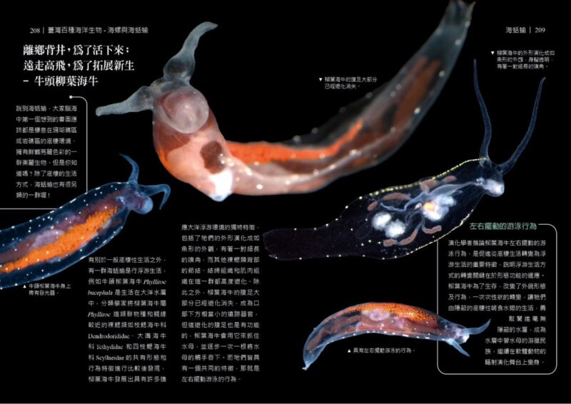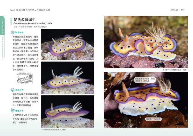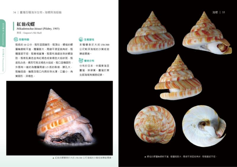 海保署說明,此本圖鑑以海螺與海蛞蝓為主題,牠們同屬海洋腹足類,種類繁多,廣泛分布於臺灣各類海岸環境中。海螺的螺殼造型多樣、色彩綺麗且變化多端,海蛞蝓物種更是擁有鮮豔瑰麗的色彩、形態優雅美麗,成為潛水攝影愛好者爭相拍攝的對象。書中的海洋腹足類有的華麗吸睛、有的低調隱秘、有的是藻食性、有些是肉食、有的撿拾底質上有機碎屑維生、有的以腐肉為食,甚至有的海蛞蝓以藻類為食物來源,盜取葉綠體來進行光合作用。由潮間帶至深海,不同的海洋環境居住著不同類型的海螺與海蛞蝓,牠們在複雜的海洋食物鏈中扮演著不同而重要的角色,是海洋生態系中不可或缺的一群生物。