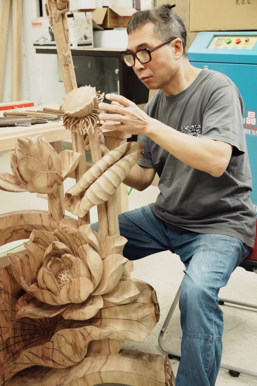 參與眾多廟宇修復工程的蔡楊吉,則以祥和、圓融為理念,一個月內完成高1米4的荷花木雕,向外遠眺的青蛙並象徵突破框架的意涵,別有意境。