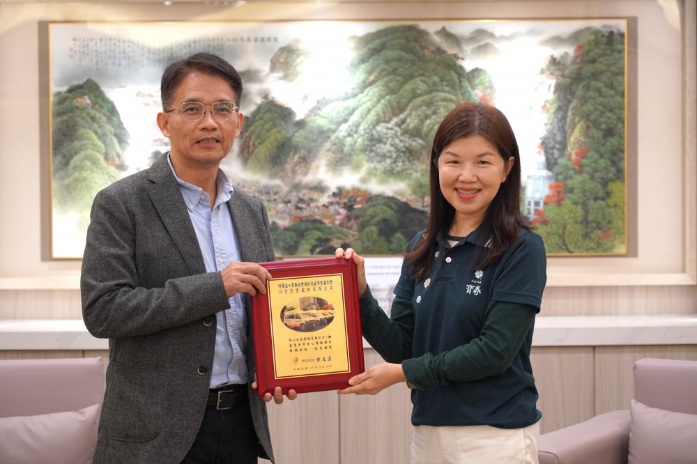 圖說:寶春基金會暨川方企業兩年捐3輛新北市復康巴士,新北市政府秘書長邱敬斌(左)10日代表受贈,並向寶春基金會執行長陳婷婷(右)致上感謝牌。