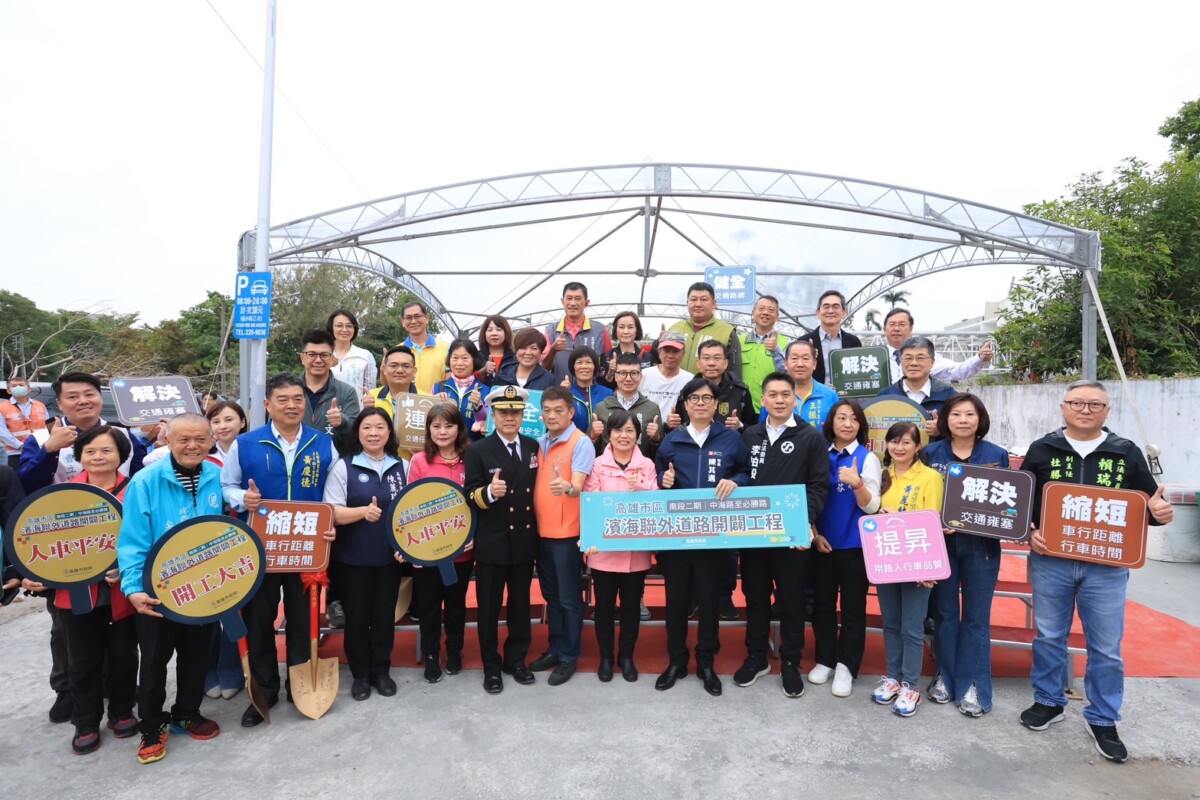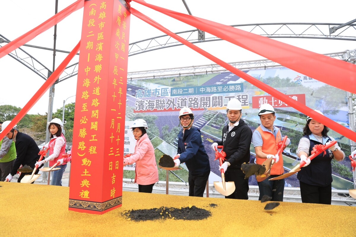 其中,南段第一期(德民路至中海路)已於去年10月開工,第二期工程下午動土,濱海聯外道路全段完成開闢後,預期可縮短橋頭至左營車行距離及減少行車時間,同時便利楠梓產業園區人流及物流運輸,紓解原台17線30~50%交通量。未來將同步導入綠道路指標設計原則,路燈採節能燈具,南段二期規劃路廊綠帶總面積達8,200平方公尺,邁進淨零碳排的目標,同時帶動濱海地區產業及觀光。