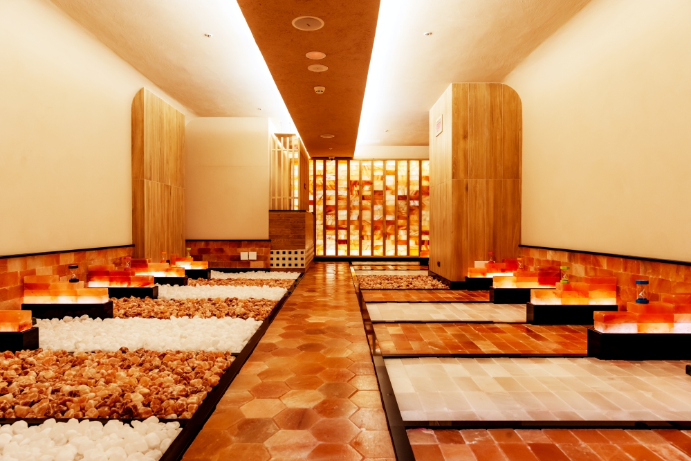 再來是「赤塩房」,選用喜馬拉雅山玫瑰鹽岩作為加熱材料,溫熱的岩鹽溫和地滲入肌膚,舒緩全身的僵硬與疲憊感,帶來深層的放鬆。作為福湯最熱門的主題房,這次更設置了雙倍床位,讓大家可以輕鬆體驗無負擔!