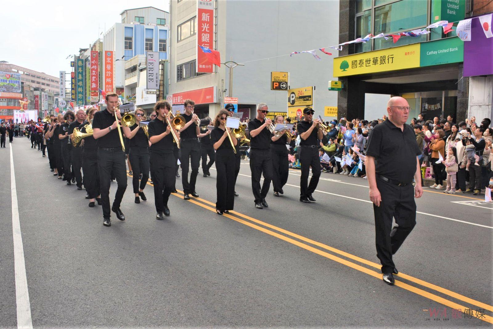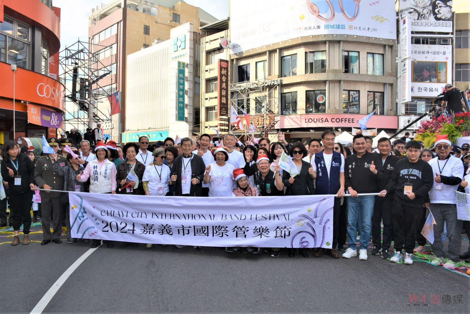 (觀傳媒嘉義新聞)【記者邱嘉琪、郭政隆/嘉義市報導】有頗具指標性的管樂盛事─嘉義市國際管樂節,今年已邁入第32屆,嘉義市這項年度盛事,嘉義市仍是依往例,12/21日下午在中央噴水池圓環,盛大舉辦踩街嘉年華;開幕儀式由法國朗塞爾市立管樂團與臺灣知名小號演奏家葉樹涵教授合作吹奏響亮的號角,以經典樂曲「愛的頌歌」作為開場,接著由東吳高職、嘉義女中舞蹈班、如婷舞蹈團及Flag Studio百人共舞,演出充滿活力的主題曲「管他什麼音樂」,緊接著富邦悍將應援團團長與啦啦隊驚喜現身,為49支踩街團隊熱血應援,大跳「臺灣尚勇」、「Team Taiwan」兩首爆紅應援神曲,這段氣勢十足的「應援」橋段,也將開幕氣氛炒熱到最高點。
