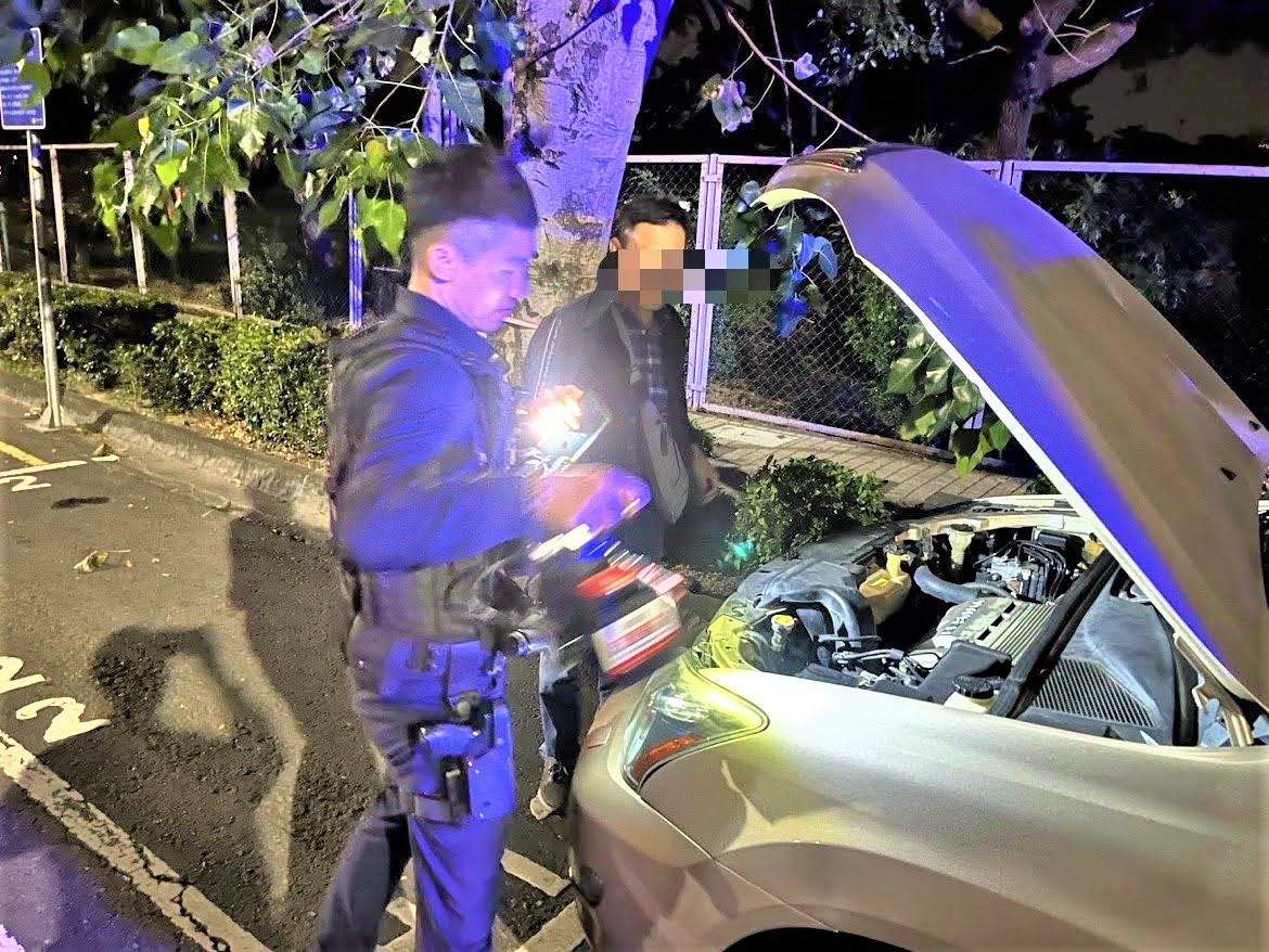 薛男向員警表示,自己車輛突然卡死在道路中沒辦法動彈,重新發動也沒有反應,正在煩惱不知如何是好的時候,正巧就遇見警方前來關心;警方於現場協助薛男查看車輛情形並將車輛打至N檔迅速移置路旁安全處,經初估檢視該部自小客車應該是電瓶沒電了,秉持為民服務的精神,員警便以巡邏車上備用電線幫車輛蓄電後成功地發動引擎。