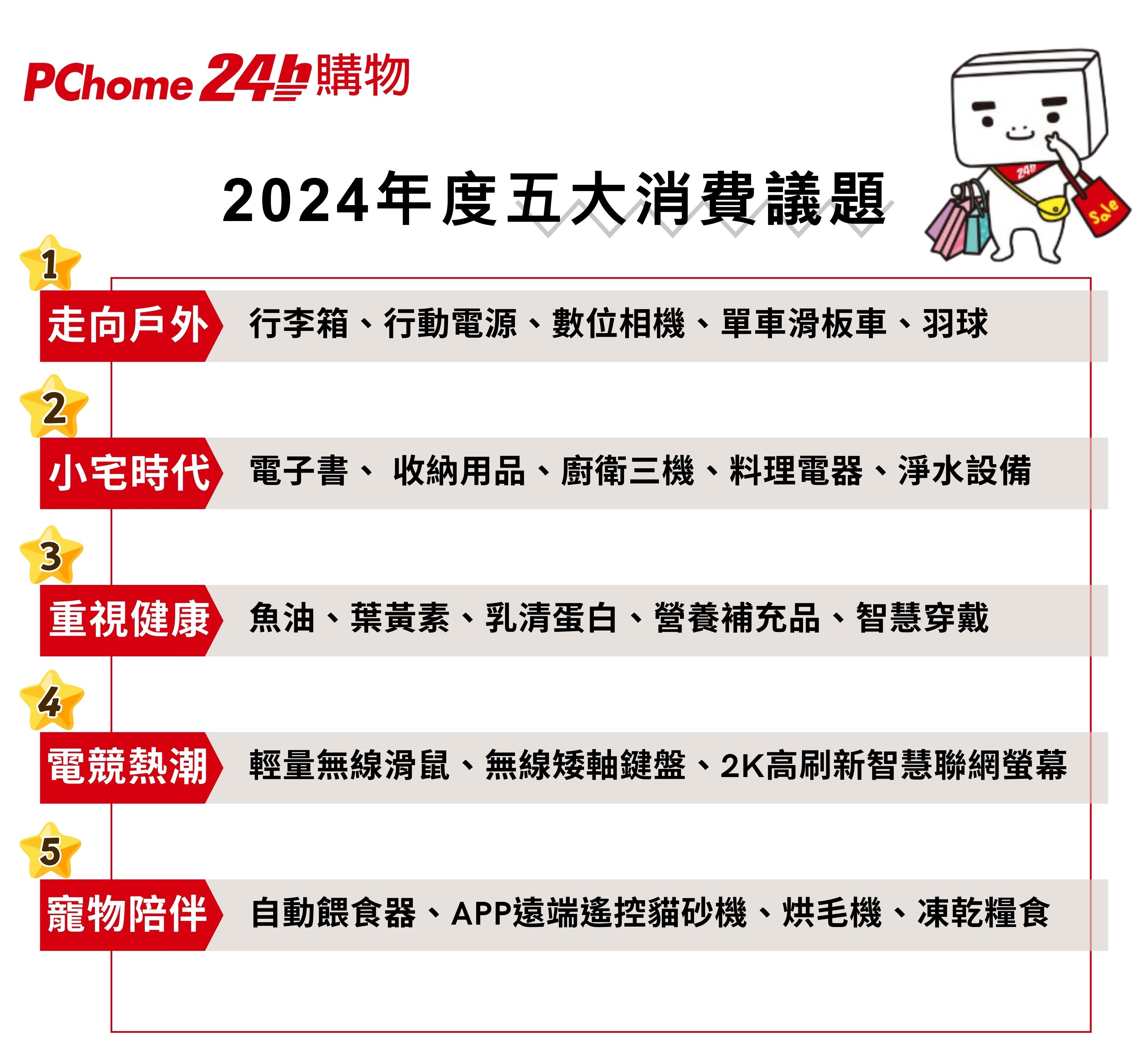 PChome 24h購物依據全站銷售數據,分析2024年五大消費趨勢,包括戶外運動、小宅精緻生活、健康意識提升、電競熱潮以及寵物經濟蓬勃發展,凸顯現代生活的多元需求。