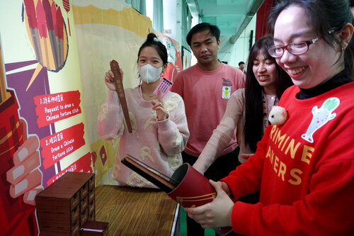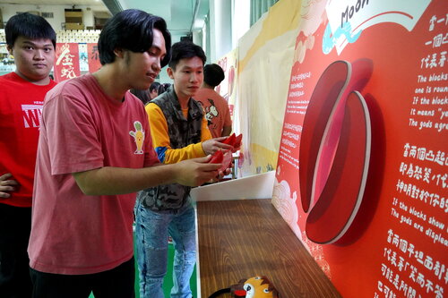 現場並安排有擲杯筊、抽靈籤,讓境外生親自體驗,感受台灣過年的氣氛,來自越南就讀觀光系一年級的同學陳氏映雪體驗抽靈籤時說,越南過年也有抽靈籤的習俗,她抽到一支好籤,覺得很開心,未來一年一定會有好運。