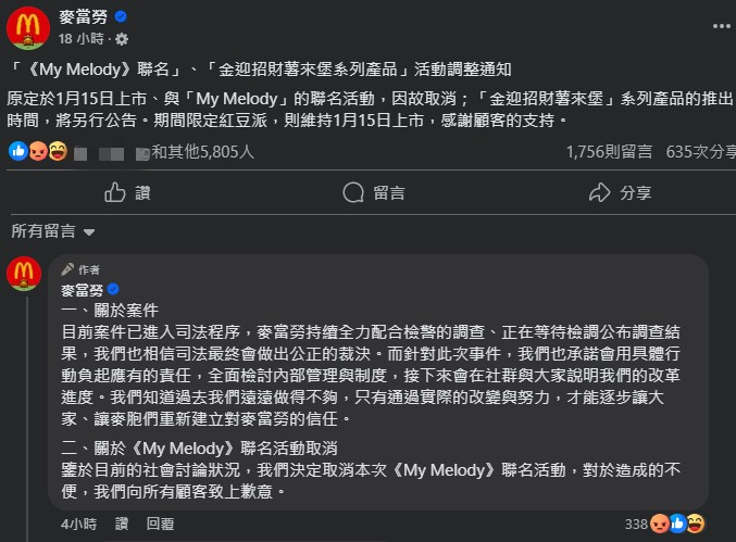 對此,麥當勞也在留言處發布2點聲明,鑒於目前社會討論狀況,決定取消「My Melody」聯名活動,造成不便,向所有顧客致上歉意。