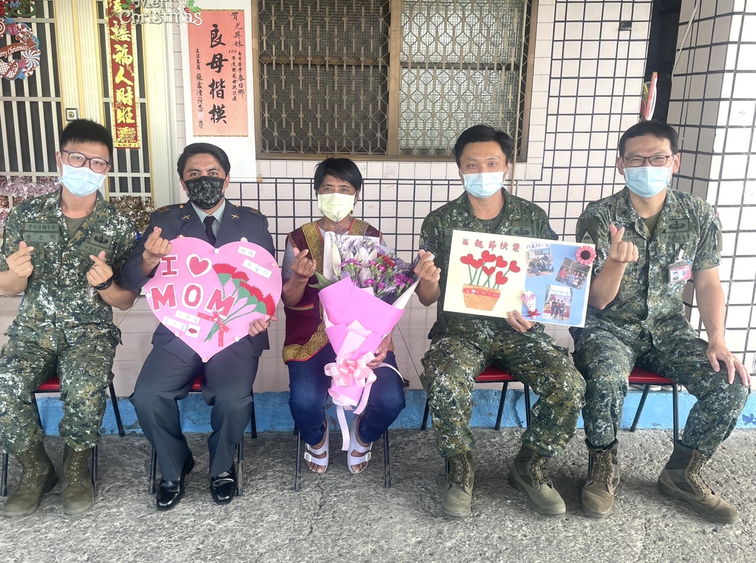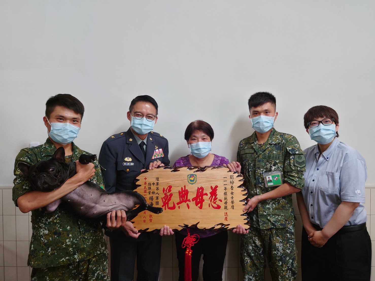 八軍團政戰主任樓偉傑少將,也代表指揮官前往劉女士家中致贈賀匾,表彰劉女士身兼父職含辛茹苦拉拔子女,鼓勵胞胎兒子從軍報國的無私奉獻。