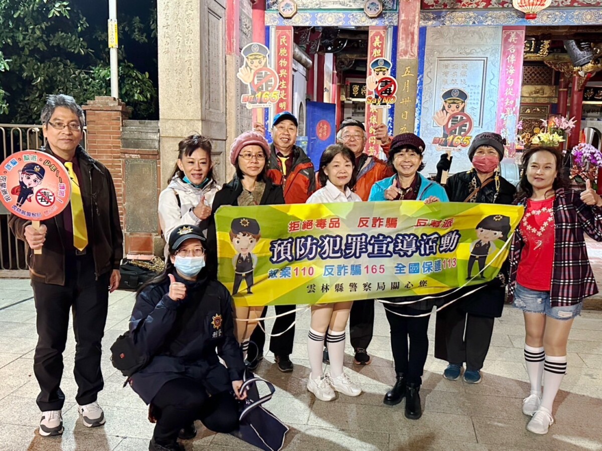 2月3日晚間,雲林縣政府在位於人潮車潮最多的圓環-顏思齊紀念碑前舉辦北港燈會啟燈儀式,人潮多就是預防犯罪宣導的好時機,北港警分局長張澤銘特別率北港派出所所長許峯豪指揮維護會場交通和秩序,也帶領預防犯罪宣導團,在人潮熙來攘往的燈區設攤宣導,呼籲鄉親春節遵守交通安全、不酒駕,全民防詐騙,平安過好年。