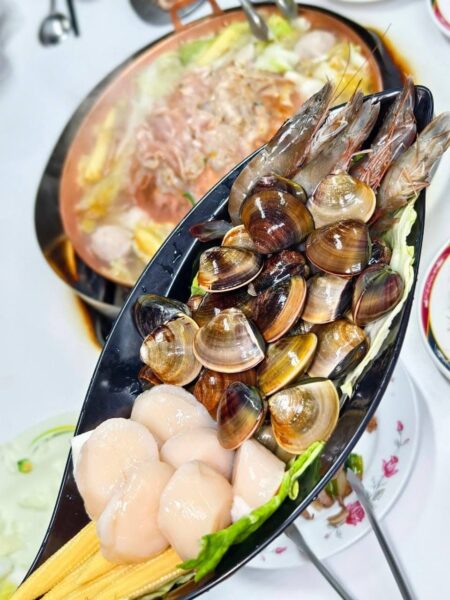銅盤中央用來炙烤肉品,而周圍的湯槽則能煮火鍋料,這裡的底湯會隨著烤肉滴落的肉汁逐漸升華風味,建議加入魷魚或海鮮提鮮,再搭配蔬菜平衡口感,能讓整體吃來不易膩口。