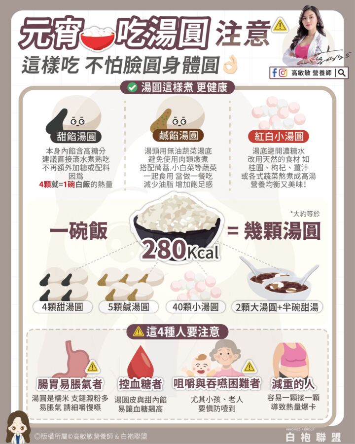 高敏敏營養師提到,紅白小湯圓雖然1顆只有6大卡,但在不知不覺間很容易過量,建議湯底避開濃糖水,可以改搭配天然的桂圓、枸杞、薑汁或來提味。營養師也建議,如果吃了湯圓,正餐的白飯就要減量,把握主食代換原則,才能避免澱粉量跟熱量攝取過多。