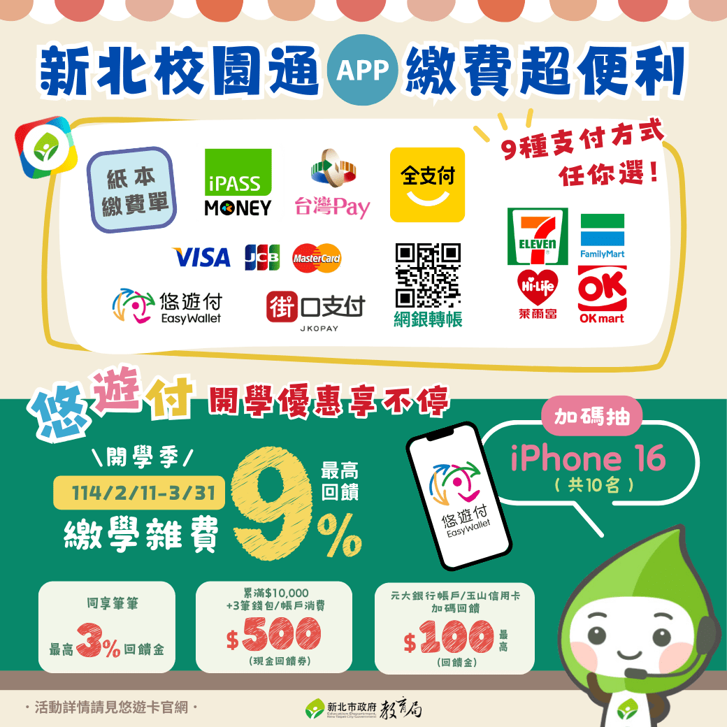 配合開學季推出多項好康回饋,新北市家長自即日起至3月31日活動期間,透過新北校園通使用「悠遊付」繳納學雜費,就享有活動回饋及抽獎機會!同一用戶繳納學雜費累計滿10,000元以上,使用悠遊付錢包或綁定銀行帳戶進行任3筆消費交易,就能獲得總價值500元現金回饋券,每月限量 1,000名(活動期間每戶限贈一次)。另外,活動期間使用指定銀行帳戶繳交學雜費,享每筆5%回饋(每戶上限100元),外加新用戶1%加碼等同於最高享有9%回饋金。不僅如此,使用悠遊付繳學雜費還能參加iPhone 16抽獎,共10個名額。另外,如使用iPass Money APP (需為iPass Money專用APP,非LINE 的 iPass Money) 「生活繳費」,可以獲得 5% 回饋 (含全台學雜費),每人每月最高回饋 100點,且多家銀行也推出信用卡繳費優惠活動,鼓勵家長多利用信用卡繳交學費,以享多重優惠。