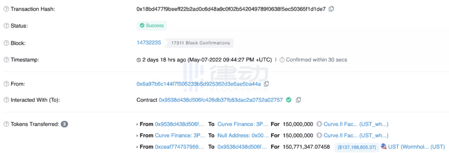 為了保持 UST-3Crv 池流動性的平衡,LFG 又從資金池裡撤走了 1 億美元的 UST。