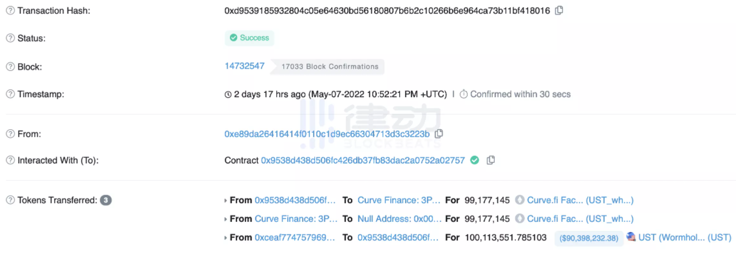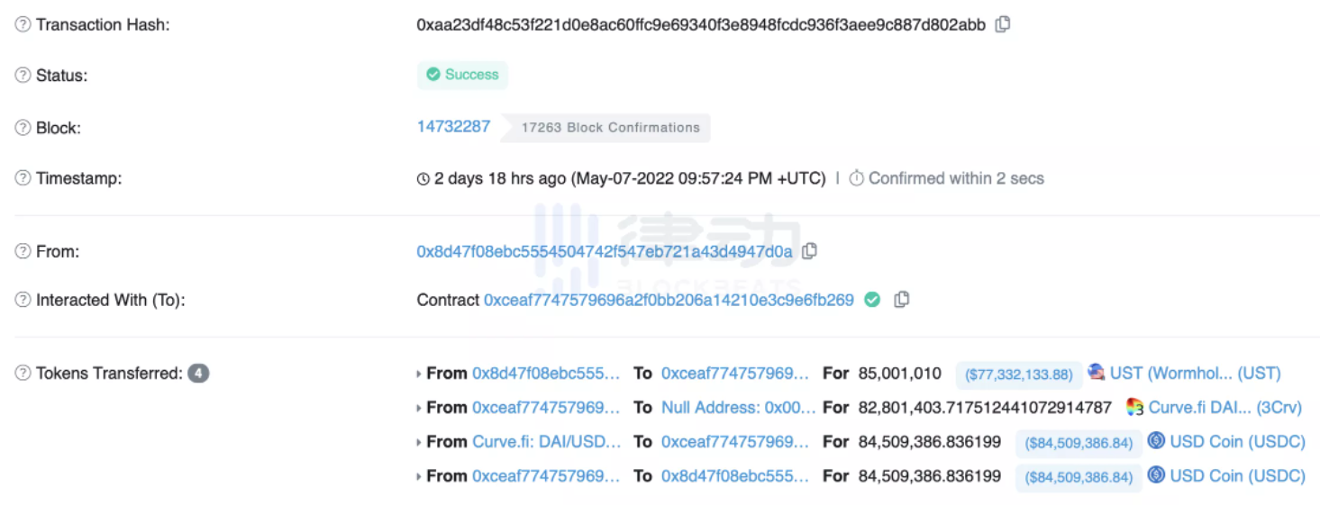 約 10 分鐘後,一個新地址突然將 8400 萬美元的 UST 拋售,嚴重影響了 3crv 池平衡。