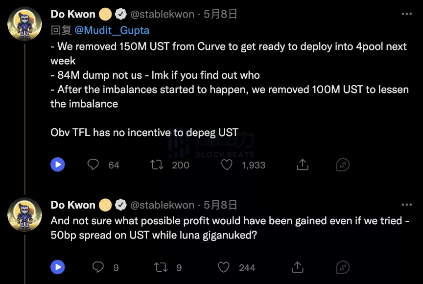 這時,推特上開始出現謠言,稱此次拋售是 LFG 在自導自演,Terra 創始人 Do Kwon 立刻在推特上作出回應。