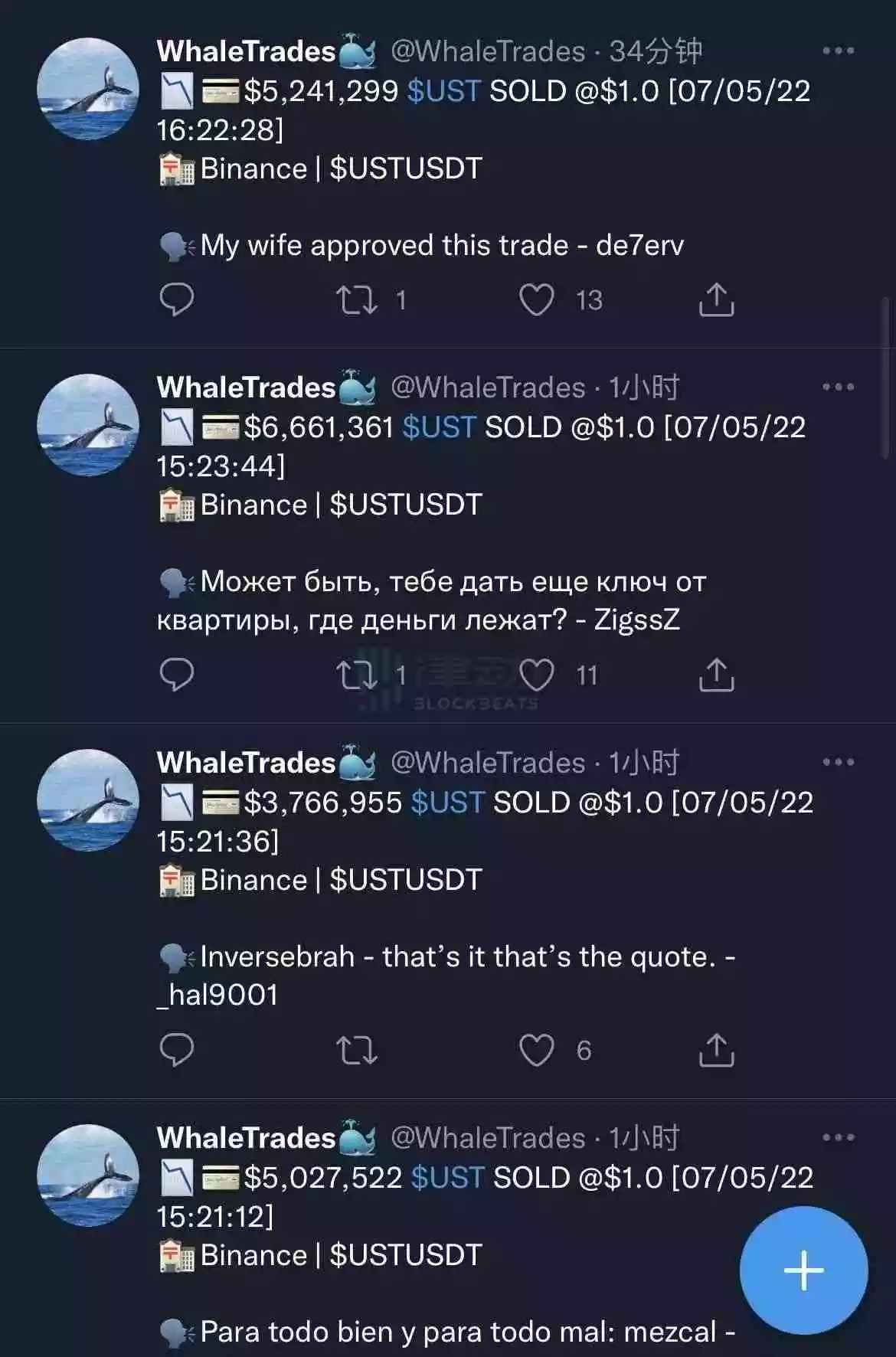 沒過多久,多個巨鯨帳戶開始不斷在 Binance 拋售 UST,每筆交易金額都是百萬美元級別。