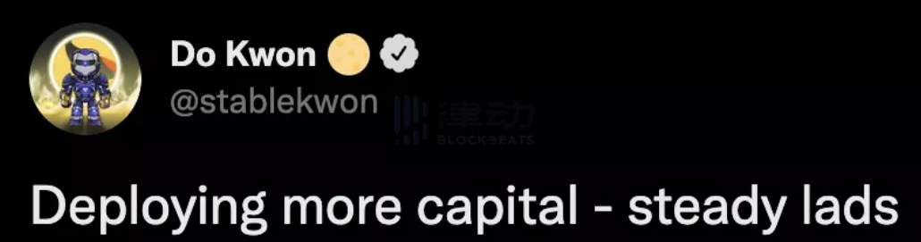 但 LFG 沒想到,UST 長期無法回歸錨定給市場帶來了極大的負面情緒,從 Anchor 裡出逃的 UST 開始大規模拋售,UST 錨定跌破 0.95 美元閥值。 LFG 被迫開始清算比特幣儲蓄,這時 Do Kwon 再次發推:「正在調動更多資金」。