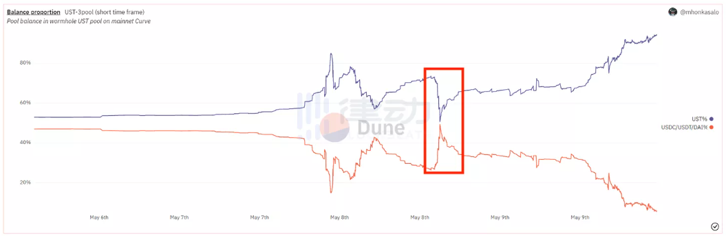 5 月 10 日早晨,Jump Trading 和 LFG 可能是意識到問題不太對勁,不再出售比特幣儲蓄以保護錨定,任憑事態惡化,UST 一路暴跌至 0.6 美元。儘管後來錨定價格有所回升,但 Curve 平台 UST-3Crv 池比例仍然嚴重傾斜,比例一度為 91.37%/8.63%。