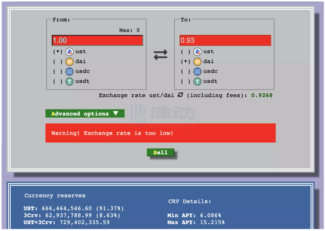 5 月 8 日凌晨,LFG 因需要為組建 4Crv 池做準備,從 UST-3Crv 池中撤走了 1.5 億美元的 UST 流動性,這時 UST-3Crv 池 TVL 在 7 億美元左右,想要耗乾 UST 流動性居然只需要 3 億美元左右。