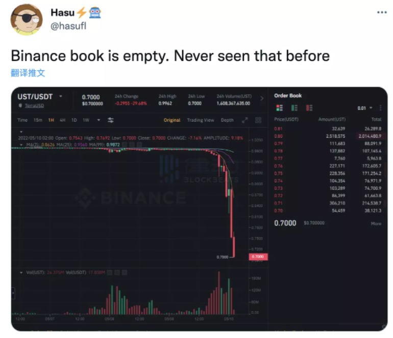 另外,Binance 似乎也參與了 UST 保衛戰。據《Uncommon Core》主理人 Hasu 稱,Binance 強行為 UST 訂單簿設置了交易地板價,在較長一段時間內用戶都無法在 0.7 美元閥值下提交訂單。