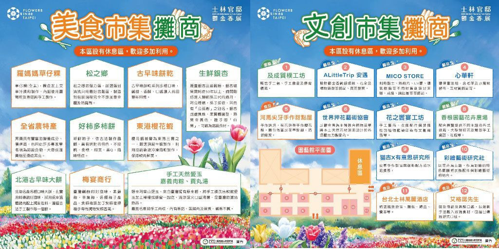 這次文創市集跟美食市集都有提供各式豐富的回饋品要給來參觀的民眾,只要參加「愛的特搜」活動,在展區中找到愛心型展件並拍照打卡,就可以帶走好禮,並且士林夜市商圈更加碼提供400張50元抵用券,讓大家逛完鬱金香展後可以到士林夜市使用,享受士林夜市特色美食!此外,您也可以利用鬱金香展與周邊57家特色店家聯合推出鬱金香展限定優惠,民眾只要至特約店家消費即可享有折扣,讓賞花之旅更加豐富有趣!相關活動訊息請關注士林官邸旅客粉絲專頁 ,也可上「花IN台北」官方網頁查詢 。