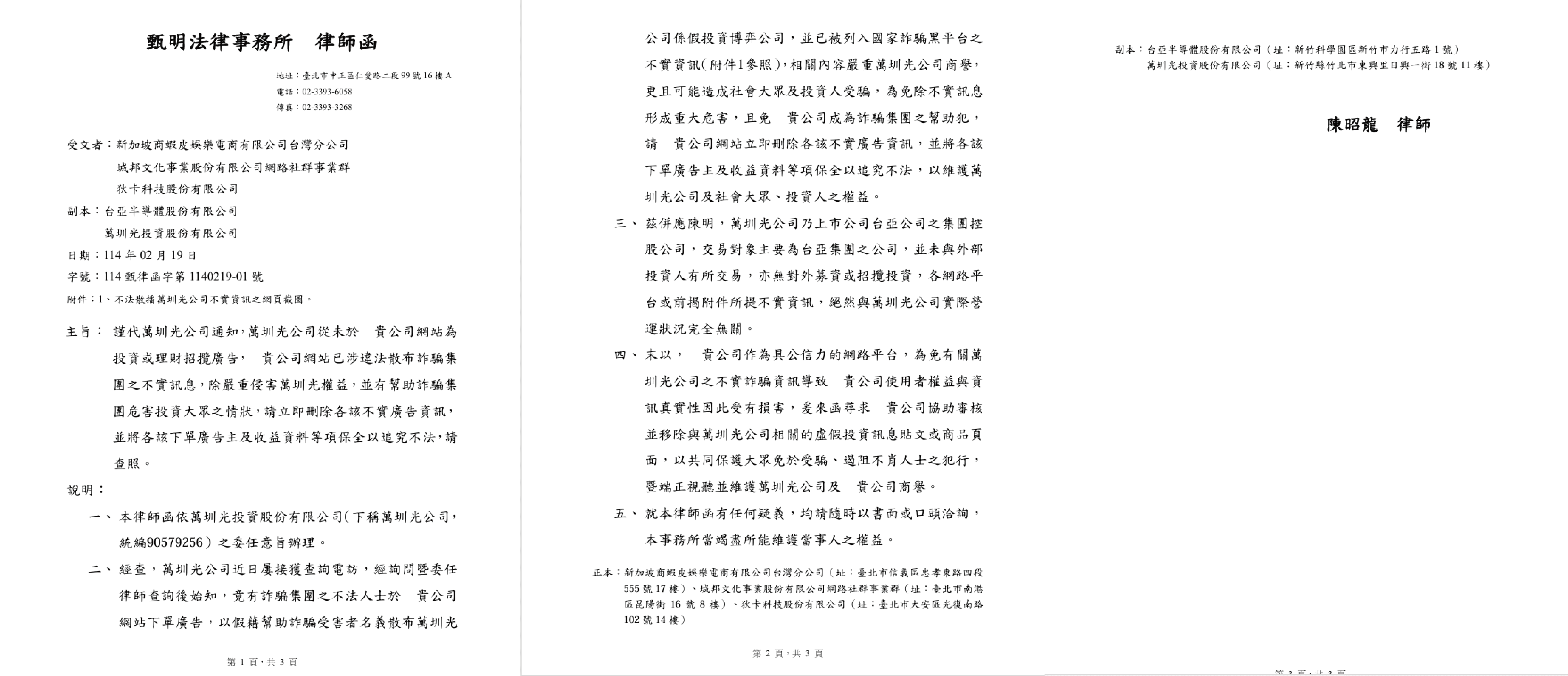 記者黃李舜/台北報導 台亞半導體集團旗下的萬圳光投資公司遭詐騙集團冒用,在蝦皮、城邦、Dcard等網站刊登投資理財招攬廣告,假藉幫助詐騙受害者名義散布萬圳光公司是假投資博弈公司,被列入國家詐騙黑平台之不實資訊;台亞集團委請律師發函要求相關網站立即刪除不實廣告,並保全下單廣告主及收益資料,以追究不法。 台亞集團今天發律師函給新加坡商蝦皮娛樂電商台灣分公司、城邦文化事業網路社群事業群、狄卡科技公司,強調詐騙集團刊登不實廣告內容嚴重損害萬圳光公司商譽,可能造成社會大眾及投資人受騙,網站平台恐有幫助詐騙集團危害投資大眾之情狀,要求移除廣告以共同保護大眾,並遏阻不肖人士之犯行。 台亞集團委請律師發函,要求相關網站移除詐騙集團冒用刊登的不實廣告。圖片來源/台亞集團提供 甄明法律事務所陳昭龍律師表示,依萬圳光投資公司委任意旨,經查萬圳光公司近日屢接獲查詢電訪,經詢問始知,竟有詐騙集團不法人士於相關網站下單廣告,以假藉幫助詐騙受害者名義散布萬圳光公司係假投資博弈公司,並已被列入國家詐騙黑平台之不實資訊,意圖詐騙投資大眾。 律師函指出,萬圳光投資是台亞公司之集團控股公司,交易對象主要為台亞集團之公司,並未與外部投資人有所交易;萬圳光公司從未於相關網站刊登投資或理財招攬廣告,也沒有對外募資或招攬投資,各網路平台所提不實資訊,絕然與萬圳光公司實際營運狀況完全無關。 台亞集團告知相關網站平台,貴公司作為具公信力的網路平台,為免有關萬圳光公司的不實詐騙資訊,導致貴公司使用者權益與資訊真實性因此受有損害, 請貴公司協助審核移除與萬圳光公司相關的虛假投資訊息貼文或商品頁面,共同保護大眾免於受騙,端正視聽並維護萬圳光公司及貴公司商譽。 此篇文章最開始出處為: 詐騙集團冒名刊登不實廣告 台亞集團要求相關網站刪除