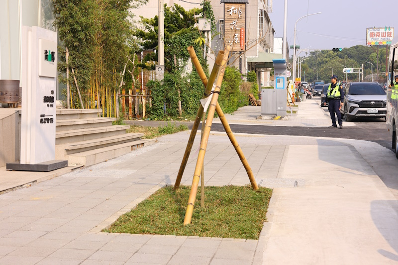 工務處說明,大雅路一段雙側改善總長度為2,380公尺,工程改善既有人行道鋪面及無障礙設施改善,增設1.5公尺自行車道,並於民權東路及文雅街口增設左轉專用車道,全段二側新增停車帶。兩處人行道皆兼具永續理念,大雅路一段工程與林業試驗所嘉義研究中心及嘉義大學植物醫學系團隊合作,連續3年進行樹木健檢後,逐步移除有安全隱患的黑板樹;北園國中小通學步道工程則與林業試驗所嘉義研究中心合作,採用台灣杉邊皮材作為步道間隙地鋪面,於北社尾路166巷採雙階式人行道設計,保留既有樹根生長空間。汲取外地考察經驗,將路燈基座下地,美化燈桿,也避免路面突起、友善行人。此外,兩處工程的人行道鋪面皆採用透水性鋪面及植栽改善優化,提升城市涼感及防洪韌性。