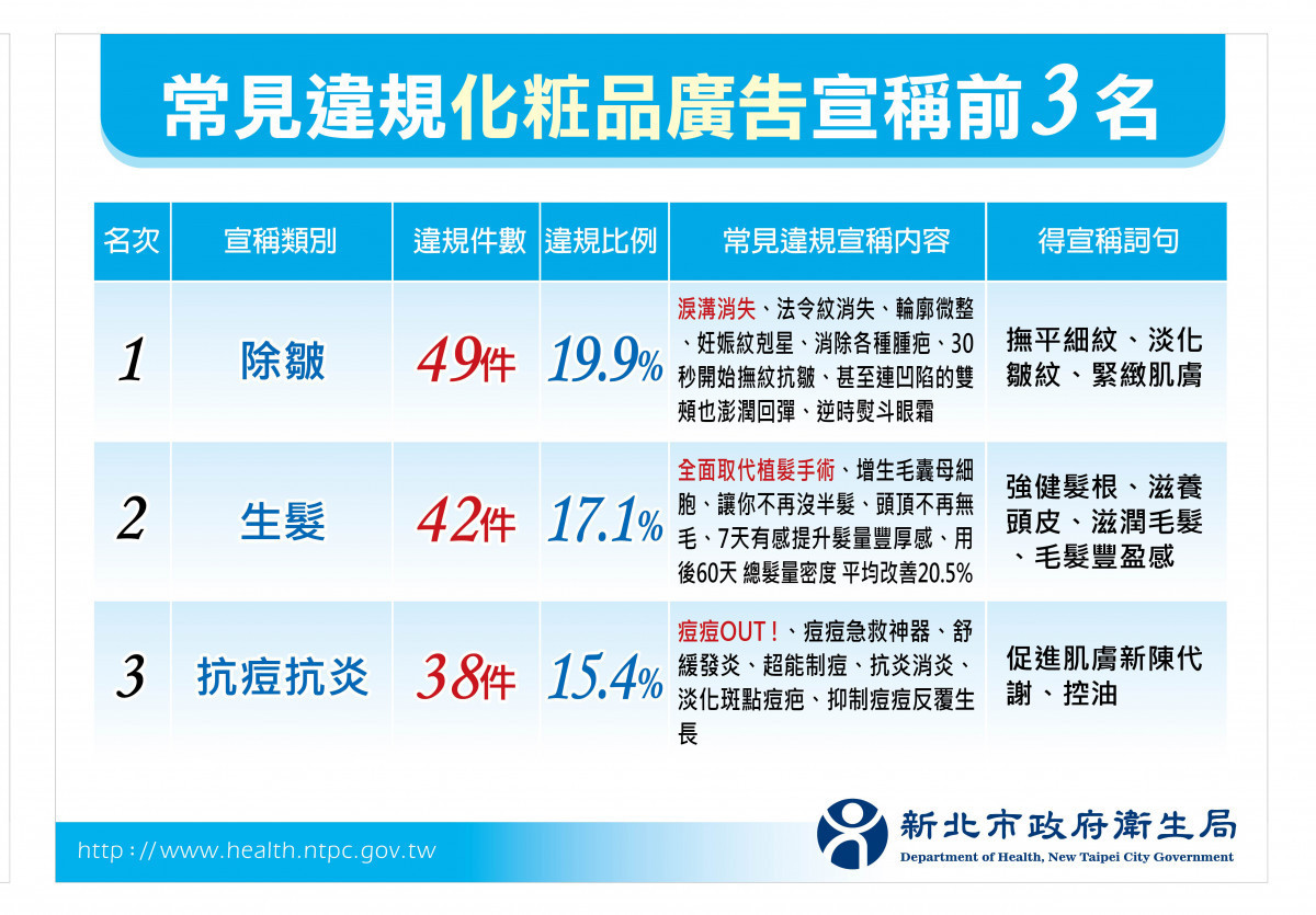 而化粧品廣告以「青春照護凝露、私密凝露」等系列產品累計罰鍰最高,自然奇蹟生物科技股份有限公司於網路誆稱「消炎、預防感染」、「白帶約7-21天(一個月療程)由增多漸減少最後消除」等療效,嚴重誤導消費者,遭裁罰124萬元,其次為「璞草園24草本全口腔潔淨慕絲菲常少量」,台灣艾博行銷有限公司於購物頻道誆稱「用了璞草園的牙膏,一星期後口角炎也好了」等消炎療效,遭裁罰61萬元。第3名為「日本墨髮美人iPS毛髮NMN復甦煥活精華」,群達國際股份有限公司於購物頻道誆稱「逆轉頭皮老化430 % 激活萎縮壞死的毛囊原基800 % 持續增生毛囊母細胞600 %」等非化粧品所能達成功效,遭裁罰14萬元。