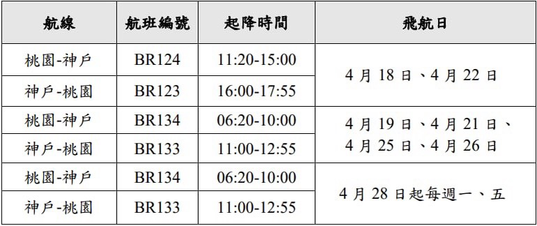 桃園-神戶開航,行程亮點將安排神戶港的標誌性建築神戶港塔、擁有悠久歷史與宏偉外觀的姬路城、可一覽壯觀讚岐平原的金刀比羅宮、號稱日本最古老溫泉的道後溫泉,以及日本國家級重要文化遺產松山城等,透過神戶及愛媛的交叉行程,旅途將可探訪岡山、淡路島明石大橋、四國高松或德島等多樣化景點,詳情可洽長榮航空各家合作旅行社,或點擊https://reurl.cc/L58ORL