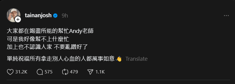影片一出,YouTube圈一面倒力挺Andy,以反指標聞名的台南Josh則在Threads發文寫下:「大家都在竭盡所能的幫忙Andy老師,可是我好像幫不上什麼忙,加上也不認識人家,不要亂蹭好了,單純祝福所有拿走別人心血的人都萬事如意」。