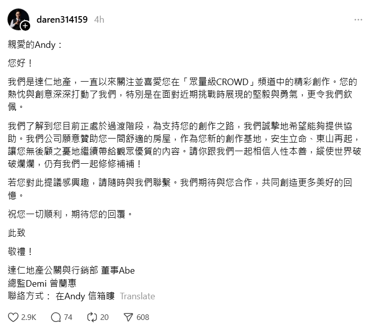 「縱使世界破破爛爛,仍有我們一起修修補補!」地產阿北特別標註Andy的帳號表示「我要送你房,我知道這時候你很忙,也知道你很委屈,更知道你買不起房的痛苦,恭喜你一夜衝百萬訂閱,我們達仁地產,想免費給你一間房」,並強調只要Andy對此提議感興趣,歡迎隨時與他們聯繫,並透露已將相關內容發送至Andy的郵件信箱:「我們期待與您合作,共同創造更多美好的回憶。」