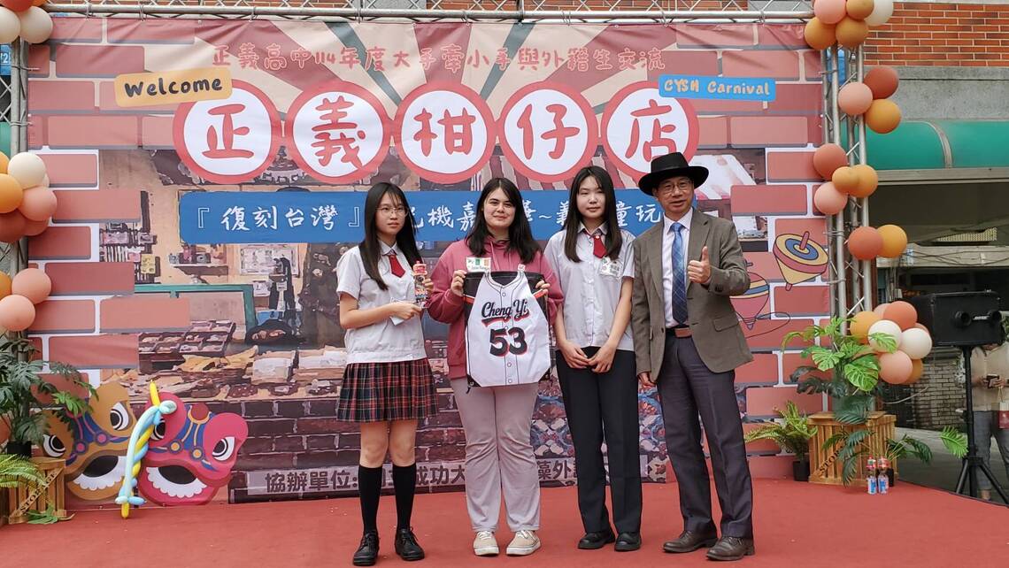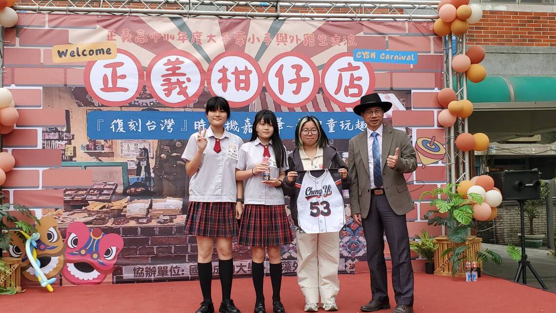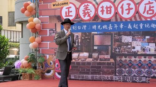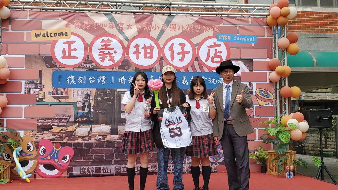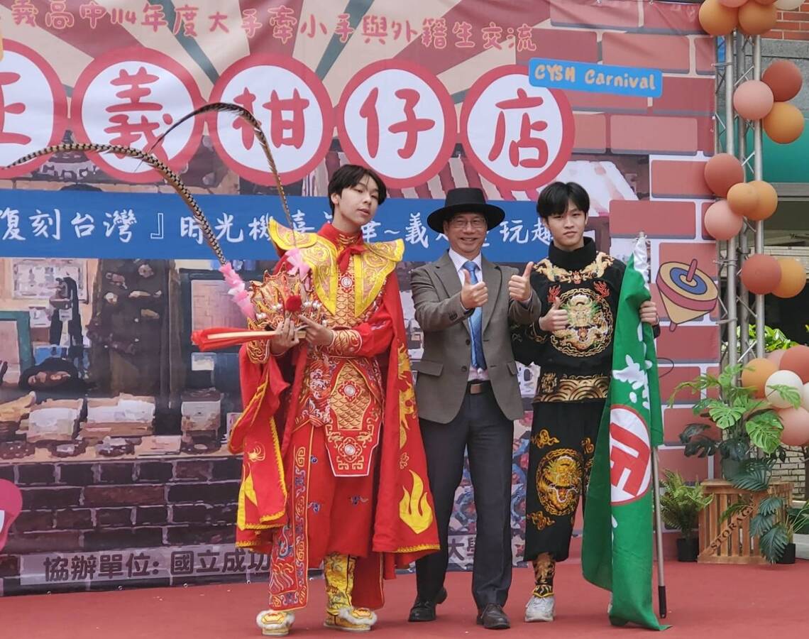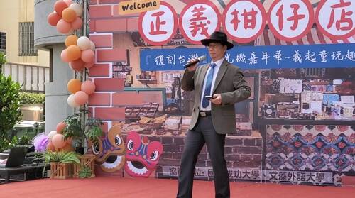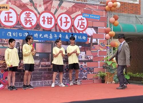 【漾新聞記者陳雯萍/高雄報導】高雄市正義中學3月20日舉辦「大手牽小手」與外籍生交流活動,以「『復刻台灣』時光機嘉年華~義起童玩趣」為主題,將舞台現場設計成台灣古早味的柑仔店。校長俞德淦上台致詞,口中說著流利的英文,但全身打扮卻是充滿著上海風,復古的氛圍,頓時充滿了笑點,也讓台下的外國大學生都驚呼連連!