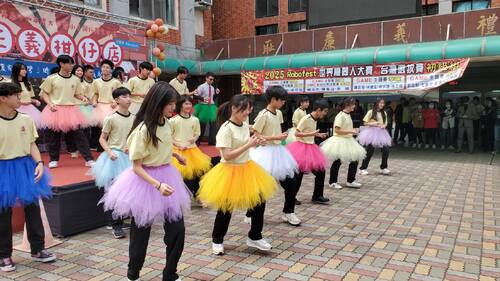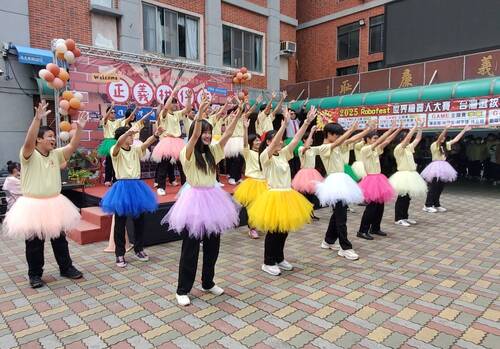 圖/正義中學高一4班學生進行的歡迎秀,不管男女生都穿起了蓬蓬裙,熱情的舞蹈,賣力的演出,為活動掀起第一波的高潮。(記者陳雯萍攝)