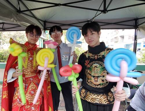 多才多藝的李鎮宇,除了川劇變臉秀,還在攤位前現場摺創意魔術氣球,送給所有的外籍生,可愛的動物與花的造型,都讓同學們愛不釋手!
