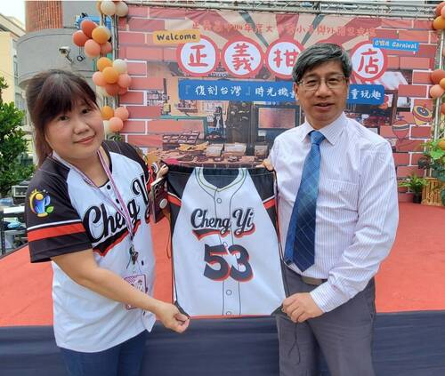 ▲校長俞德淦(右)與訓育組長(黃淑絹)展示送給外籍生每人一個用去年校慶運動服製作的背袋,極具紀念價值。(記者陳雯萍攝)