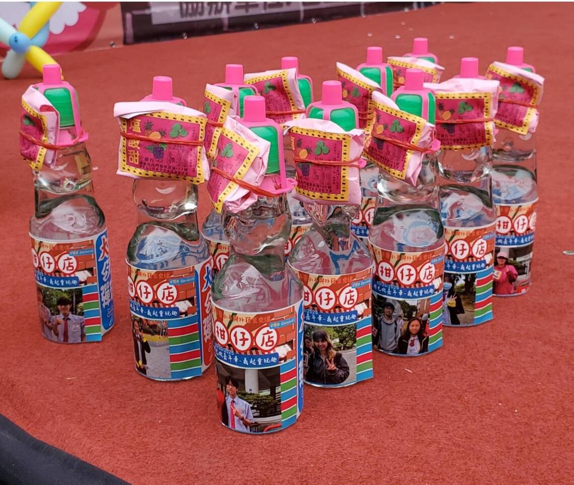 圖/學校送的「鹹酸甜」與彈珠汽水,重點是外籍生與親善大使學生的合照。(記者陳雯萍攝)