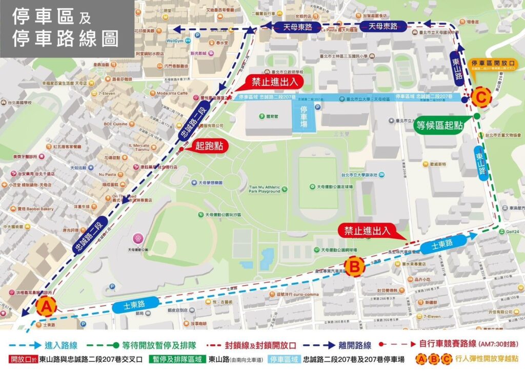 活動期間賽道沿線實施交通管制,禁止車輛通行,管制範圍內之公車候車處暫停服務,民眾如欲查詢公車改道路線,請利用臺北市公共運輸處網站(http://www.pto.gov.taipei/)查詢相關資訊。