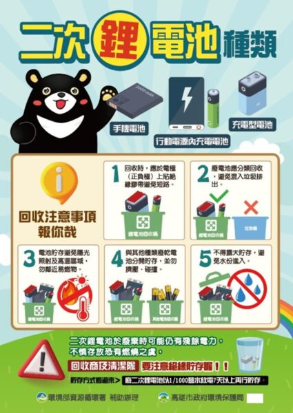 環保局呼籲市民,家中取出的廢電池,放入塑膠袋或合適容器後,除可交由各區清潔隊資源回收車、量販店或便利超商回收外,亦有其他多元化管道可回收鋰電池;例如本局與區里合作之「希望種子資收站」及搭配本局辦理之回收兌換宣導品活動等,各項活動之回收兌換標準及兌換物品請上〈樂活綠高雄資源回收好康報〉臉書粉絲專頁(https://www.facebook.com/recycle.ksepb.gov.tw)查詢。
