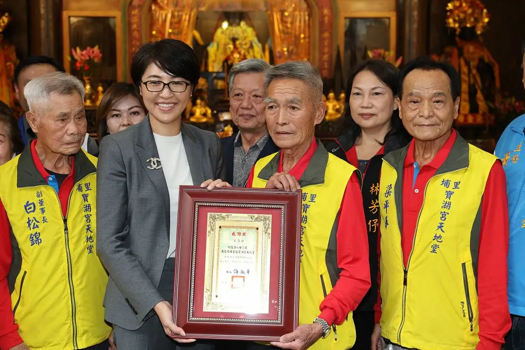 許縣長8日下午由縣府社勞局長林志忠、民政處長林琦瑜及縣議員林芳伃、黃世芳陪同親赴寶湖宮天地堂地母廟,由董事長梁平定率董監事等廟方執事團隊引領許縣長,虔誠向地母娘娘上香,獻花、獻果、獻財帛,最後並行三鞠躬最敬禮,祭儀圓滿後,許縣長致贈感謝狀及「地母慈悲」匾額,由梁董事長及眾執事代表接受。同時,縣議會副議長潘一全、議員吳國昌及埔里鎮民代表會主席林釧儀也都指派專人到場致意。