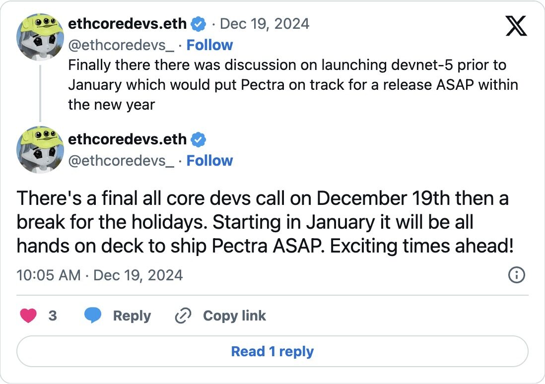 Pectra 升級已經備受期待數月,現在有了正式的上線日期:2025 年 5 月 7 日。如果一切按計劃進行,這將是以太坊有史以來最大的一次更新。