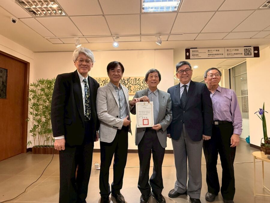 圖/人文與藝術學院黃智陽院長(左二)頒贈感謝狀給書法教育月刊社蔡明讚社長(中)。(華梵大學提供)
