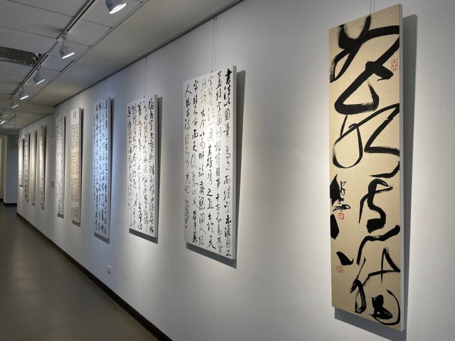 圖/浙江省青年書法家協會主席梁小鈞作品〈曲水流觴〉(右一)大受好評,同排其他大陸書法家作品也相當吸睛。(華梵大學提供)