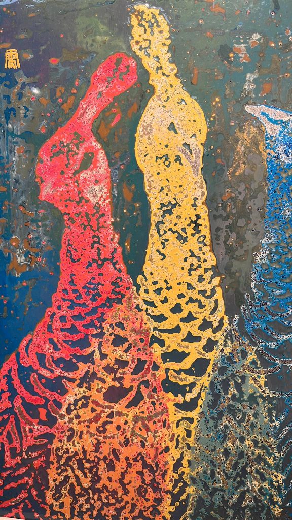 《因緣起合》系列每幅作品,都像是從生活某個片段中慢慢醞釀而來。畫中,看時間的光,理緣分的形;那些層層漆底被留下的痕跡——絢麗,卻靜謐;深藏象徵著欲望與祝福的力量。