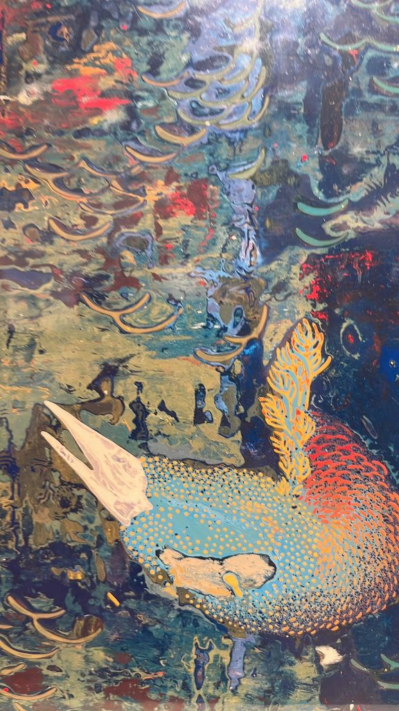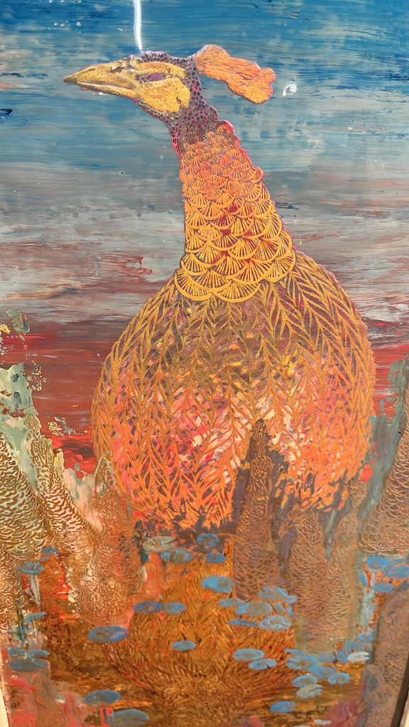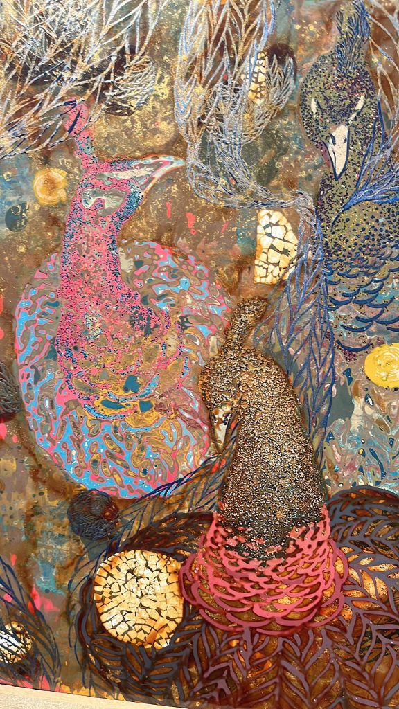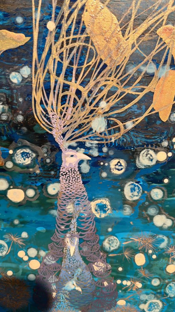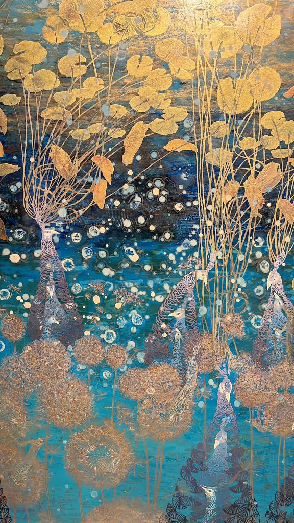 漆畫,是極慢的藝術,需要等待。打磨、推光,每一個步驟,急躁不得。「每一次創作,都是與時間的合作。」從童年對孔雀羽毛的驚豔開始,那些斑斕的視覺經驗,悄悄成為王雯今天藝術創作的核心精神。她筆下的孔雀羽紋,不僅是記憶的再現,更記錄著生命中每一次美好的相遇與交織。